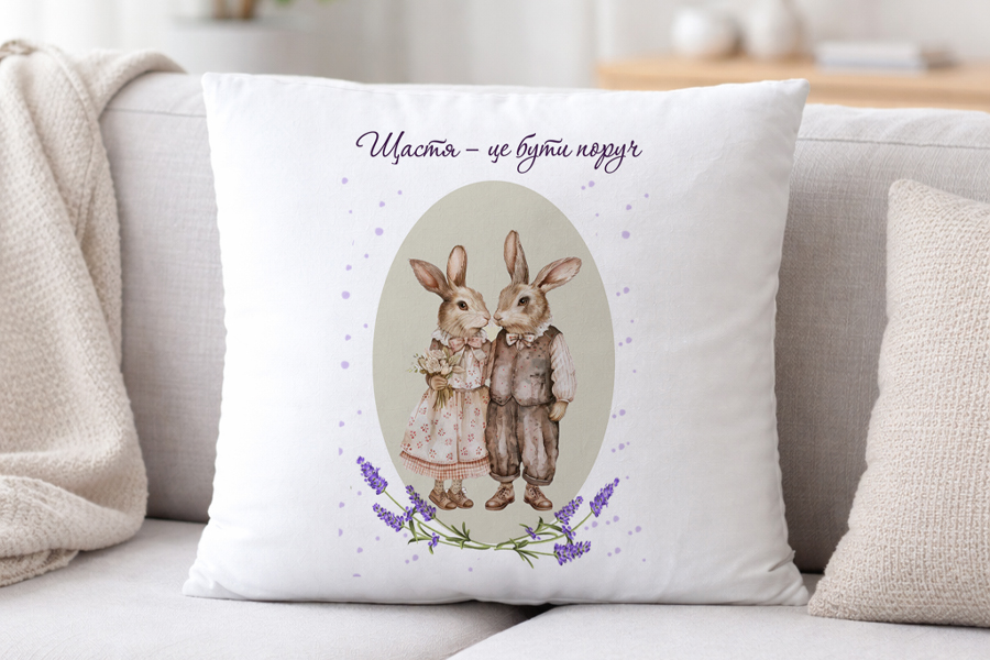 М’яка біла плюшева подушка приємна на дотик та стане стильним акцентом в інтер’єрі або мили м подарунком для своєї другої половинки. Лаконічеий дизайн в стилі прованс з двома закоханими зайчиками та квітками лаванди виглядає романтично та стильно, а напис додає емоційності та почуттів.