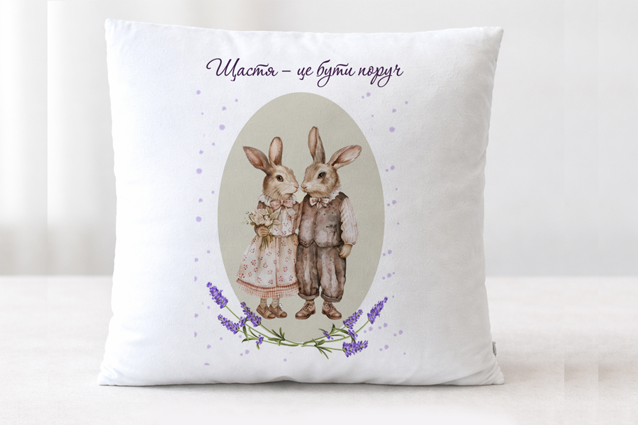 - Дизайн: пара закоханих зайчиків з квітами лаванди, напис