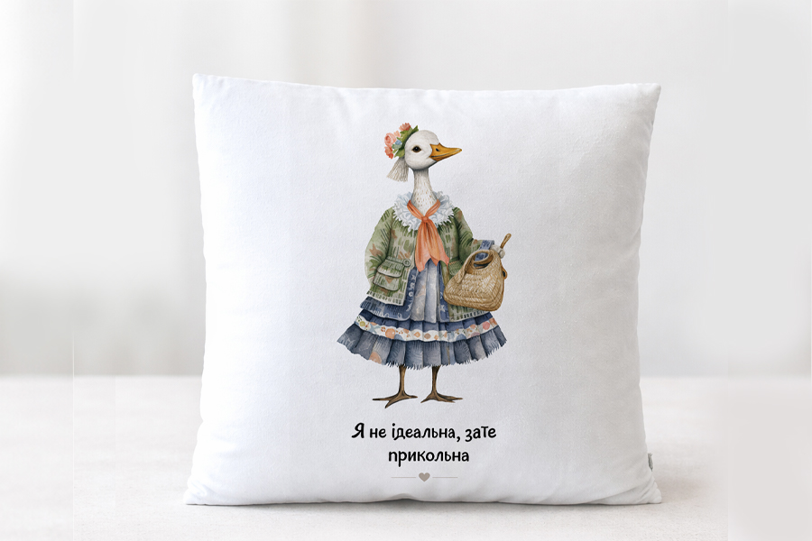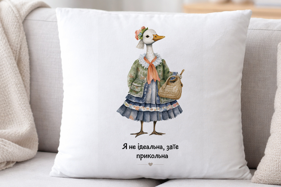 Подушка декоративна плюшева 35×35 см біла з принтом модної пані гуски в красивому платті , яка триває жіночу сумочку та прикольним написом “Я не ідеальна, зато прикольна”.